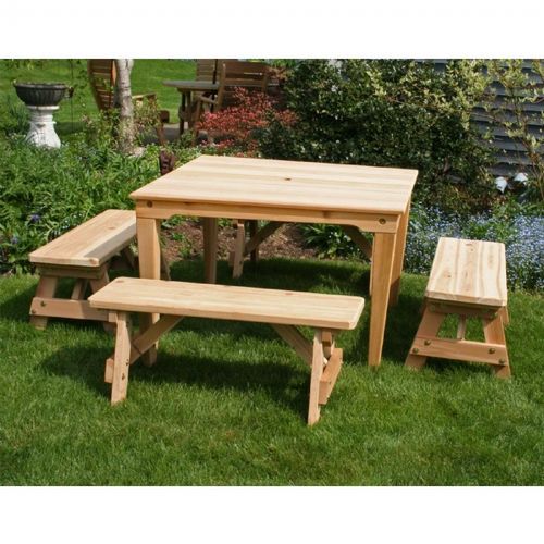 Cedar social dining set natural. It has casual backless benches that stay elegant in short lengths. The square table is understated, but can be played up with a colorful outdoor patio umbrella. It is made of high quality red cedar that transforms simple design to high-end styling. This set includes a table and 4 backless benches and it comes with an optional 2" umbrella hole. It is made up of natural western red cedar wood and its hardware is zinc plated steel. It features two separate option for stain/sealer in cedar or white with an additional fee of 28%. It also has rounded and sanded edges and it is made in the U.S.A.