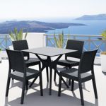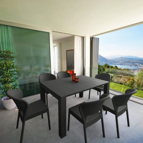 Rattan Gray Daytona extendable dining set with six dining chairs and one table that extends from 70 inches to 86 inches. Wickerlook resin is a natural looking un-woven one piece furniture technology. Wickerlook patio furniture is made with open weave design that resembles traditional woven wicker furniture. Unlike any other woven furniture in the market Wickerlook furniture will never unravel. Made for commercial durability. Chairs are stackable. UV treated. Hose down for cleaning. Withstands outdoor temperatures summer and winter. Chairs certified for strict European standards by CATAS Italian research institute and test laboratory.