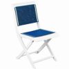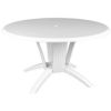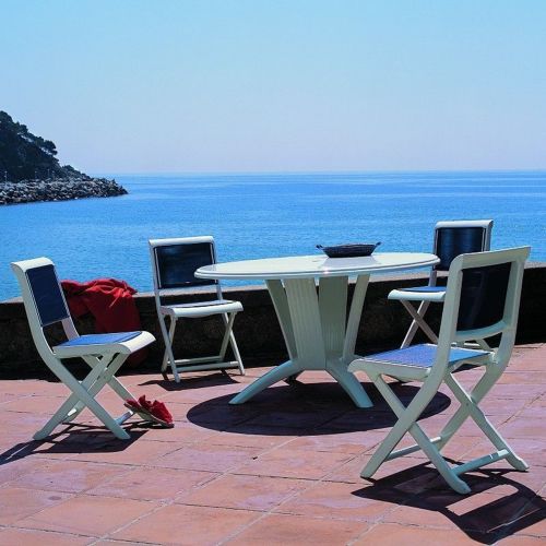 Triconfort Elysee garden dining set with 4 chairs and one round table. Chairs and table finest quality marine grade lacquered resin. Chairs in porotex mesh. Round table with pedestal legs and resiceram top. For 4 guests. Elegant and decorative. Great set for poolside, patio or boats. Chair cushions sold separately. Frame Color: White lacquered resin.