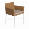 Hardy outdoor dining set with four arm chairs and a rectangle dining table from Triconfort. Offers five star luxury. Contemporary and modern outdoor furniture design. Chairs made from synthetic outdoor wicker over aluminum tubing. Maintenance free. Very strong. Can be washed down with water. Totally outdoor resistant. Cushions are made from Sunbrella fabric and durable for outdoor use. Cushions included. Table made from aluminum frame with teak top. Maintenance free. Very strong. Can be washed down with water. Totally outdoor resistant. Frame is offered in two colors; white and manganese. Table top is teak wood for both frames.