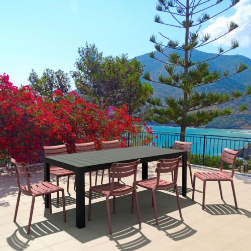 Siesta LogoHelen 9 piece extendable dining set with eight chairs and one rectangle table. Chairs and table top made from marine grade polypropylene. Great for outdoor spaces, patios and decks. Used by restaurants, cafes and hotels.