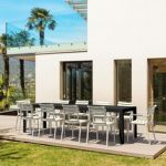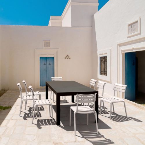 Helen 9 piece extendable dining set with eight chairs and one rectangle table. Chairs and table top made from marine grade polypropylene. Great for outdoor spaces, patios and decks. Used by restaurants, cafes and hotels.