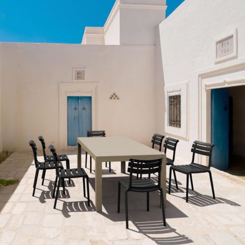 Siesta LogoHelen 9 piece extendable dining set with eight chairs and one rectangle table. Chairs and table top made from marine grade polypropylene. Great for outdoor spaces, patios and decks. Used by restaurants, cafes and hotels.