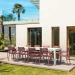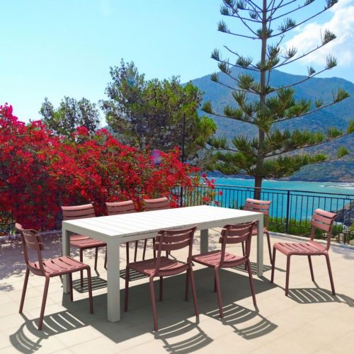 Helen 9 piece extendable dining set with eight chairs and one rectangle table. Chairs and table top made from marine grade polypropylene. Great for outdoor spaces, patios and decks. Used by restaurants, cafes and hotels.