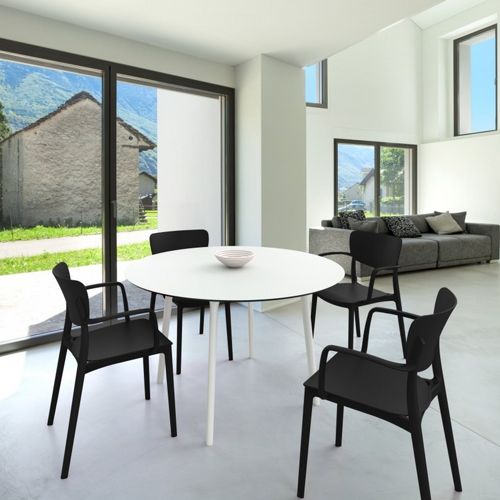Lisa patio dining set with white Maya round table 47 inch and Lisa armchairs. Maya HPL laminated table top with the latest generation of airmoulding thermoplastic legs. Very strong and heavy. Lisa resin dining armchairs offer modern design combined with commercial strength. Dining set can be used in modern or traditional settings indoor or outdoor. Chairs made from marine grade resin with gas injection molded legs. Smooth seat and back for easy cleaning. Set is great for patios, balconies, garden and poolside dining. Accomodates four guests. Chairs are stackable. Certified for strict European standards by CATAS Italian research institute and test laboratory.