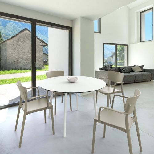 Siesta LogoLisa patio dining set with white Maya round table 47 inch and Lisa armchairs. Maya HPL laminated table top with the latest generation of airmoulding thermoplastic legs. Very strong and heavy. Lisa resin dining armchairs offer modern design combined with commercial strength. Dining set can be used in modern or traditional settings indoor or outdoor. Chairs made from marine grade resin with gas injection molded legs. Smooth seat and back for easy cleaning. Set is great for patios, balconies, garden and poolside dining. Accomodates four guests. Chairs are stackable. Certified for strict European standards by CATAS Italian research institute and test laboratory.
