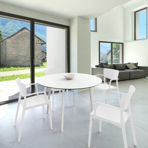 Siesta LogoLisa patio dining set with white Maya round table 47 inch and Lisa armchairs. Maya HPL laminated table top with the latest generation of airmoulding thermoplastic legs. Very strong and heavy. Lisa resin dining armchairs offer modern design combined with commercial strength. Dining set can be used in modern or traditional settings indoor or outdoor. Chairs made from marine grade resin with gas injection molded legs. Smooth seat and back for easy cleaning. Set is great for patios, balconies, garden and poolside dining. Accomodates four guests. Chairs are stackable. Certified for strict European standards by CATAS Italian research institute and test laboratory.