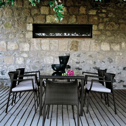Outdoor patio dining set from Emu. Set contains six dining arm chairs with cushions and a 64 inch dining table. Contemporary Italian design. All weather wicker over aluminum tubing. Exquisite quality. Six chairs and one rectangle table. Outdoor wicker available in two colors natural and dark brown. Cushions available in two colors natural-white and light brown.