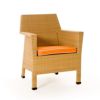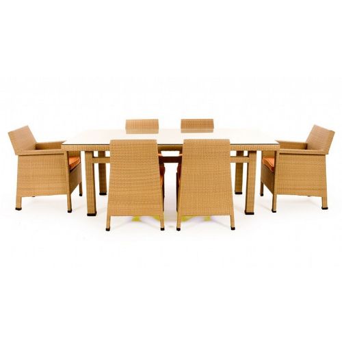 Mayan outdoor wicker dining set from Caluco. Set includes two armchairs, four side chairs, one rectangle dining table. Contemporary and modern outdoor furniture design. Perfect for dining outdoors. Made from Viro outdoor wicker over strong extruded powder coated aluminum frame. Maintenance free. Can be washed down with water. Totally outdoor resistant. Cushions are made from Sunbrella fabric and durable for outdoor use. Seat cushions included. Wicker available in Wheat only. Cushions are 2 inch thick.
