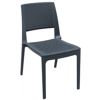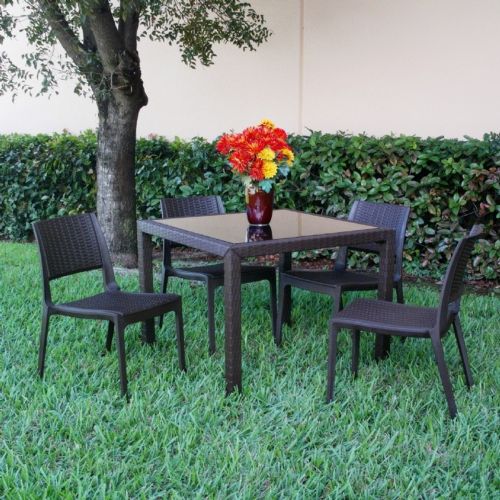 Miami Wickerlook resin patio dining set with four armless dining chairs and one square table. Wickerlook resin is a natural looking un-woven one piece furniture technology. Wickerlook patio furniture is made with open weave design that resembles traditional woven wicker furniture. Unlike any other woven furniture in the market Wickerlook furniture will never unravel. No moving parts that can break. Made for commercial durability. Chairs are stackable. UV treated. Hose down for cleaning. Withstands outdoor temperatures summer and winter. Table has tempered glass and legs have levelers for uneven surfaces. Chairs certified for strict European standards by CATAS Italian research institute and test laboratory.