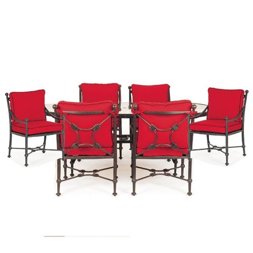 Origin cast aluminum patio dining group with six dining chairs and one 84 inch oval table. Classic Mediterranean design cast aluminum dining furniture collection. Strong cast and tubular frames come with four inch Sunbrella cushions. All corners are welded 360° for maximum strength and powder coated so it won't chip, fade, or scratch. Desert bronze color frames gives a traditional aged look. Perfect for outdoors. Cushions are made of Sunbrella fabric and available in multiple colors. Cushion covers can be machine washed. Cushion included in price.