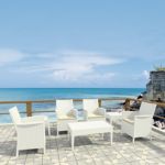 Orlando white resin patio dining set with four dining chairs and one square table. Wickerlook resin is a natural looking un-woven one piece furniture technology. Wickerlook patio furniture is made with open weave design that resembles traditional woven wicker furniture. Unlike any other woven furniture in the market Wickerlook furniture will never unravel. Made for commercial durability. Chairs are stackable. UV treated. Hose down for cleaning. Withstands outdoor temperatures summer and winter. Chairs certified for strict European standards by CATAS Italian research institute and test laboratory.