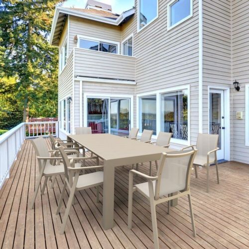 Color: White - TaupeI have been looking for a large dining set like this and so happy to find this one. Taupe sling chairs are very comfortable and they stack. Table is the largest I can find online. There will be a lot of large family dinners this summer!