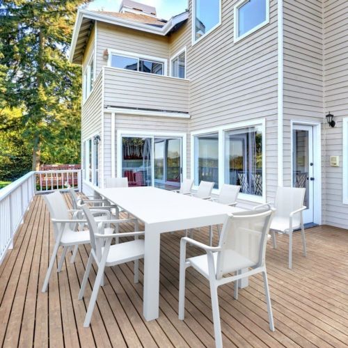 Color: White - TaupeI have been looking for a large dining set like this and so happy to find this one. Taupe sling chairs are very comfortable and they stack. Table is the largest I can find online. There will be a lot of large family dinners this summer!