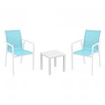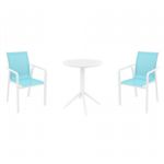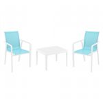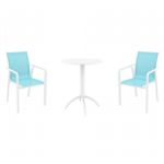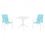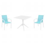 Pacific resort quality dining set with ten turquoise sling arm chairs and an extension table. Simple sleek design with commercial strength. Sling is made with Serge Ferrari mesh fabric. Chair is very comfortable and no need for cushions. Stacks for easy storage. Frame made of marine grade resin polypropylene. Extremely durable and comfortable. Commercial grade.