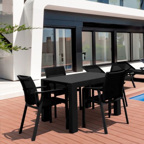 Pacific resort quality dining set with four sling arm chairs and an extension table. Simple sleek design with commercial strength. Sling is made with Serge Ferrari mesh fabric. Chair is very comfortable and no need for cushions. Stacks for easy storage. Frame made of marine grade resin polypropylene. Extremely durable and comfortable. Commercial grade.