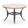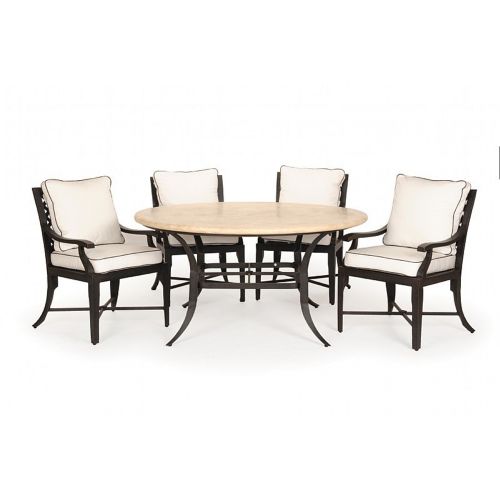 Paris contemporary cast aluminum dining set includes four dining chairs and one 48 inch round stone top dining table. French style contemporary design cast aluminum furniture collection. Strong cast aluminum frames come with three inch Sunbrella cushions. Triple polished with a powder coated paint and an antique finish, so it won't chip, fade, or scratch. Perfect for outdoors. Color: Desert Bronze. Cushions are made of Sunbrella fabric and available in multiple colors. Cushion covers can be machine washed. Cushion included in price.