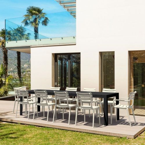 Siesta LogoParis 11 piece extendable dining set with ten arm chairs and one rectangle table. Chairs and table top made from marine grade polypropylene. Great for outdoor spaces, patios and decks. Used by restaurants, cafes and hotels.