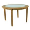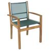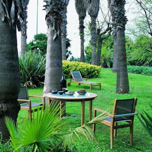 Kettal Aruba teak patio furniture dining set with round table and four arm chairs. Table and chairs structured in top quality teak and anodized aliminum tubing. Chair seat and back in porotex fabric available in two colors. Table top in sanded glass. Aged teak with smooth feel. Modern and aesthetic. Frame resistant to outdoors. Patio furniture set of four armchairs and one round table.