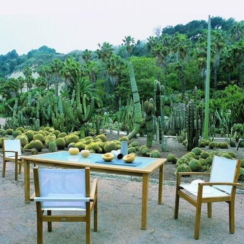 Kettal Aruba teak patio furniture dining set with large rectangle table and six arm chairs. Table and chairs structured in top quality teak and anodized aliminum tubing. Chair seat and back in porotex fabric available in two colors. Table top in sanded glass. Aged teak with smooth feel. Modern and aesthetic. Frame resistant to outdoors. Patio furniture set of six armchairs and one rectangle 82.7" × 43.3" table.