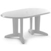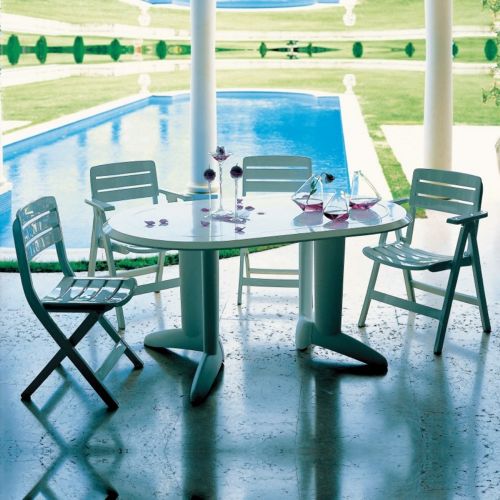 Evolutif Ascot patio furniture dining set with four folding chairs two folding armchairs and one oval table. High gloss lacquer coated resin gives an elegant look for any pool and patio area. White lacquered marine grade resin. Very elegant. Resistant to outdoors. Outdoor table has a 1.5" capped hole for umbrellas.