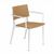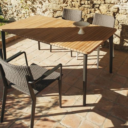 Riba outdoor dining set with four dining arm chairs and one rectangle table from Triconfort. Offers contemporary design with five star luxury. Chairs made from synthetic outdoor wicker over aluminum tubing. Maintenance free. Very strong. Can be washed down with water. Totally outdoor resistant. Table made from aluminum frame with teak top. Maintenance free. Very strong. Can be washed down with water. Totally outdoor resistant. Frame is offered in two colors; white and manganese. Table top is teak wood for both frames.