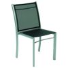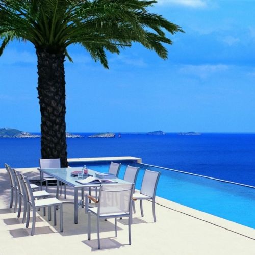Triconfort Rivage lacquered aluminum outdoor dining set with six chairs, two armchairs and a rectangle dining table. High end outdoor furniture at it's best. Very elegant and aesthetic. Outdoor furniture dining set offers five star luxury. Seats and backs in porotex mesh sling for added comfort. No cushions needed. Aluminum frames have multiple layers of lacquer paint just like in luxury cars. Outdoor dining set is 100% outdoors resistant. Light and comfortable. Available in white frame-white mesh, gray frame-white mesh, gray frame-black mesh. Table has painted glass top.