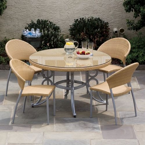 Sabbia outdoor wicker dining group. Includes four dining chairs and one 48 inches round dining table with glass top. Features sturdy powder coated aluminum frames braided with all weather wicker. Resistant to harsh outdoor conditions. Natural color outdoor wicker provides this modern design with a traditional touch. Great choice for garden, poolside, patio or deck. Table has a hole for umbrella.