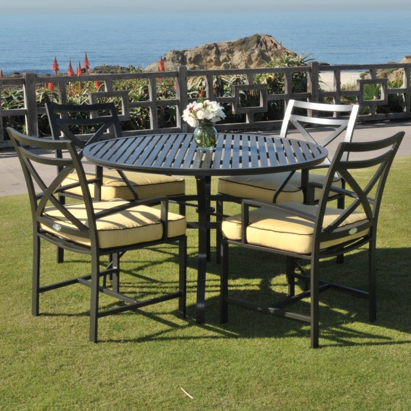 San Michelle cast aluminum outdoor dining set includes four armchairs with seat cushions and one 48 inch round table. Contemporary design cast aluminum furniture collection. Strong cast and tubular frames come with four inch Sunbrella seat cushions. All corners are welded 360° for maximum strength and powder coated so it won't chip, fade, or scratch. Perfect for outdoors. Table has a 1.97 inch hole to fit an umbrella. Plastic foot levelers included. Color: Charcoal Gray. Cushions are made of Sunbrella fabric and available in multiple colors. Cushion included in price.