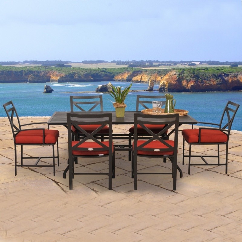 San Michelle cast aluminum patio dining set includes six armchairs with seat cushions and one 72 inch rectangle table. Contemporary design cast aluminum furniture collection. Strong cast and tubular frames come with four inch Sunbrella seat cushions. All corners are welded 360° for maximum strength and powder coated so it won't chip, fade, or scratch. Perfect for outdoors. Plastic foot levelers included. Color: Charcoal Gray. Cushions are made of Sunbrella fabric and available in multiple colors. Cushion included in price.