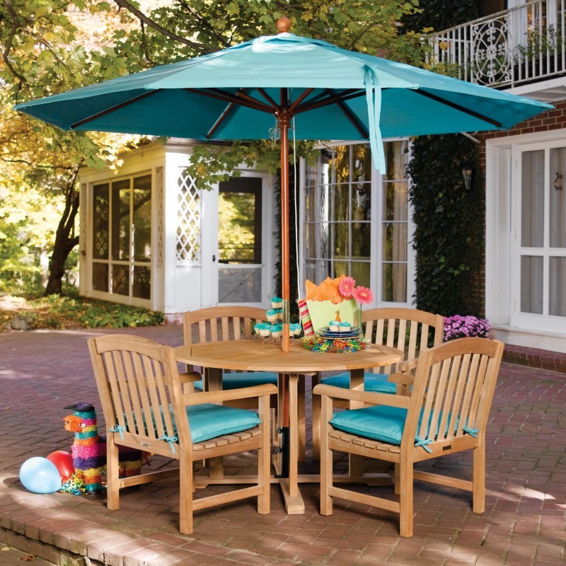 Chadwick outdoor dining set with 4 arm chairs and one 48 inch round dining table from Oxford Garden. Traditional design with gently arched back and deep seating. Slotted table top allows for water to pass through, preventing ponding. Table has a removable 1 and ⅝ inch plug to allow for an umbrella. Table leg joinery is wood to wood for a solid union. Handcrafted of shorea hard wood using mortise and tenon joinery, shorea furniture will last for years to come. Shorea wood is tropical hardwood comparable to teak which is very resistant to water, sun and outdoor elements.
