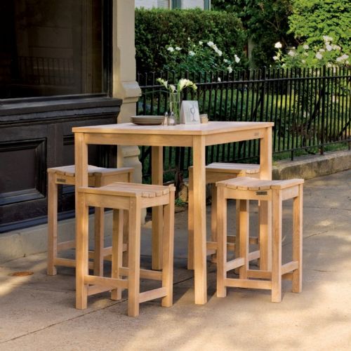 Counter height dining set from Classic collection is inspired by the English garden witha practical touch. Set includes four stools and one 28 inch square counter table. Handcrafted of shorea hard wood using mortise and tenon joinery, shorea furniture will last for years to come. Shorea wood is tropical hardwood comparable to teak which is very resistant to water, sun and outdoor elements.