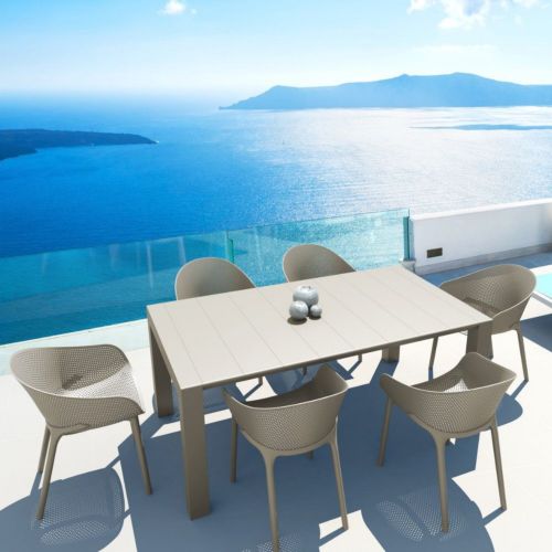 Sky extendable dining set with six dining chairs and one dining table that extends from 70 inches to 86 inches. Simple modern European design. New addition to our indoor-outdoor transitional sets. Chairs made with polypropylene construction and a poly seat. Chair legs are reinforced with fiber glass. Contemporary set can be used indoors or outdoors. Tested and certified for strict European standards by CATAS Italian research institute and test laboratory. Easy Assembly required.