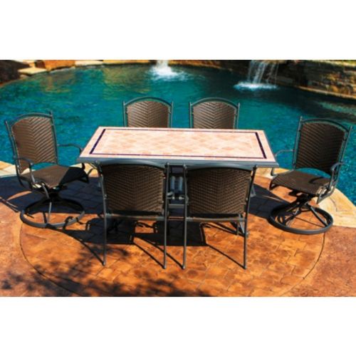 Tuscan Lorne 7 piece outdoor dining set with four chairs, two swivel rockers and one 65 inch rectangle table. Dining set is made from powder coated aluminum with antique gray finish and handbraided with all weather wicker. Table has pre-sealed natural stone mozaic top with unique travertine design. Chairs are stackable. Resistant to harsh weather, winter and hot sun. Very elegant design. Wicker offered in mahogany color.