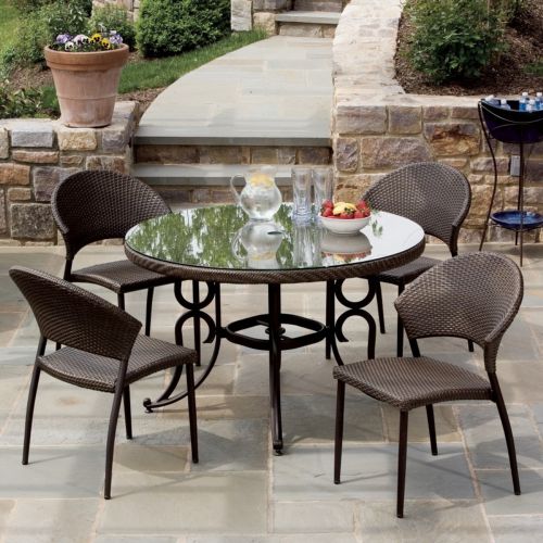 Vento outdoor wicker dining group. Includes four dining chairs and one 48 inches round dining table with glass top. Features sturdy powder coated aluminum frames braided with all weather wicker. Resistant to harsh outdoor conditions. Java color outdoor wicker provides this modern design with a traditional touch. Great choice for garden, poolside, patio or deck. Table has a hole for umbrella.