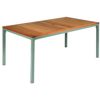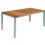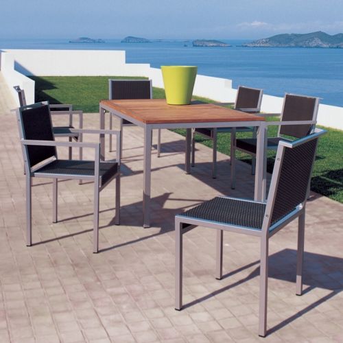 Kettal Via aluminum outdoor wicker dining set with teak top dining table. Includes four dining chairs, two arm chairs and one rectangle dining table with teak top. Via collection frames are made of aluminum finished with heat processed polyester paint for extreme resistancy to outdoors. All chairs are hand braided with all weather wicker. Armchairs have teak accents. Table top is teak wood. Simple European design. Very elegant and aesthetic. 100% outdoors resistant. Chairs available in two color combinations. gray Frame - Natural Wicker and gray Frame - Etna Wicker. Table available in matching frame color.