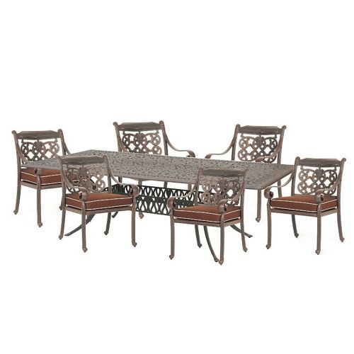 Victoria cast aluminum garden dining set with seat cushions. Garden set includes six dining chairs and one rectangle 84 inch table. Traditional English garden design cast aluminum dining furniture. Collection items provide spacious proportions. Strong cast and tubular frames come with four inch Sunbrella seat cushions. Aluminum is powder coated so it won't chip, fade, or scratch. Desert bronze color frames gives a traditional aged look. Perfect for outdoors. Cushions are made of Sunbrella fabric and available in multiple colors. Cushion covers can be machine washed. Cushion included in price. Frame color: Desert Bronze.