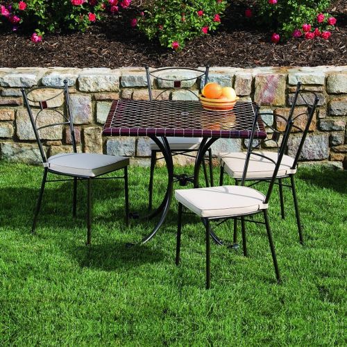 Cognac wrought iron dining set with four chairs and one 35 inch square mozaic top table. Traditional bistro design. All frames are made from top quality wrought iron with a durable powder coat finish. Table is made with hand made glazed ceramic mosaic. Bistro set suitable for both indoor and outdoor use. Moving indoors during subzero temperatures recommended. Seat cushions included in natural color.