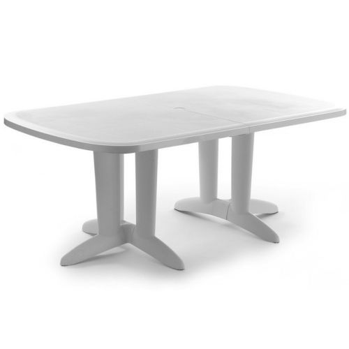 Evolutif Dangari rectangular outdoor patio dining table. Sturdy rectangular dining table with 70 inches in length and 44 inches in width. Available in marine grade white resin. Resin outdoor furniture is extremely durable for hot sun and harsh weather conditions. Available only in white. Table has hole for umbrella. Hole is 2 ½ inches with 3 size clamps inside. Made in Europe. Dimensions: 70"L × 44"W × 28.7"H