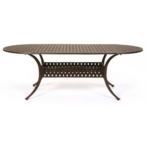 Jordan cast aluminum oval outdoor dining table. Country club style dining table measures 84 inches. Made of high quality cast aluminum and is triple polished with a powder coated paint and an antique finish. Cast aluminum won't chip, flake or scratch. Perfect for outdoors, gardens, patios. Easy assembly required. Comes with a 2 inch umbrella hole. It accommodates 8 guests. Plastic foot levelers included. Color: Desert Bronze.