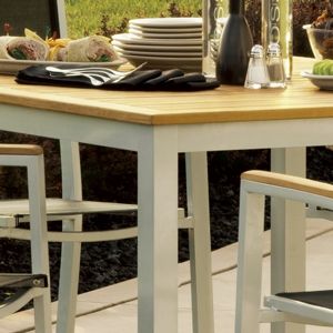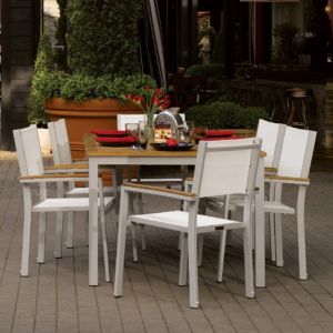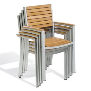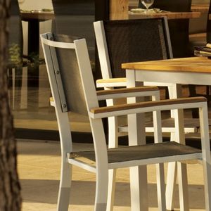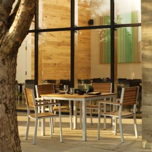 Travira Collection from Oxford Garden offers lightweight aluminum frames combined with mesh or teak wood seats and backs. Dining chairs are stackable and suitable for commercial use. Aluminum frames are powder coated with light metallic grey.