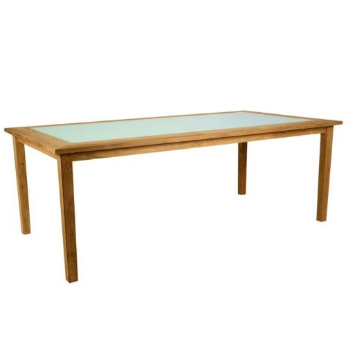 Kettal Aruba rectangular outdoor dining table. Size 82.7" × 43.3" . Structure in top quality teak and anodized aliminum tubing. Resistant to outdoors. Aged teak with smooth feel. Table top in sanded glass.