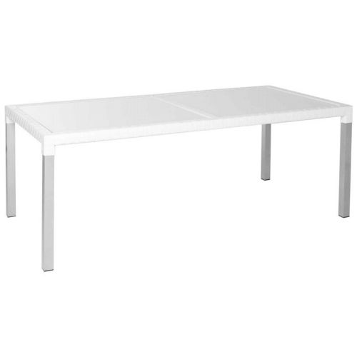 Tidelli Cube rectangle dining table. Luxury dining furniture with contemporary features. Hand finished aluminum tubing with synthetic Ti-Flex wicker. Frame resistant to outdoors. Includes clear glass table top. Wicker available in white. Frame in silver color. Table doesn't have an umbrella hole. Dimensions: 78"L × 40"W × 28"H