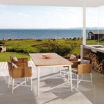 Hardy outdoor dining table from Triconfort. Offers contemporary design with five star luxury. Made from aluminum frame with marble top. Maintenance free. Very strong. Can be washed down with water. Totally outdoor resistant. Frame is offered in two colors; white and manganese. Table top is natural white marble for both frames.