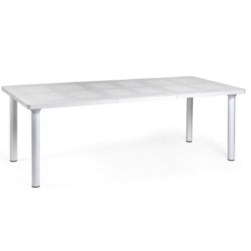 Libeccio resort quality extension dining table with resin top and painted aluminum legs. Table top is a marvel of modern design with extension up to 86 inches. Extension piece allows table to grow from 63 inches to 86 inches. Extension can be stored under the table. Table top made of marine grade resin. Extremely durable and comfortable. Commercial grade. Resistant to UV, salt, chlorine and suntan oils. Resin stays cool to the touch under hot sun. Table has an umbrella hole with or without the extension. Table legs are aluminum with surface levelers. Table legs have a round profile.