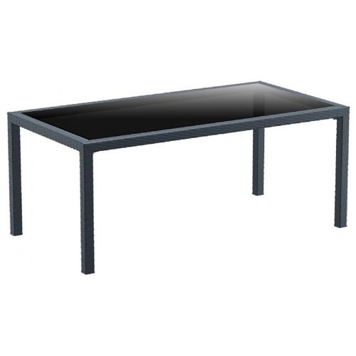 Miami woven-wicker-looking rectangle patio dining table. Wickerlook resin is a natural looking un-woven furniture technology. Wickerlook patio furniture is made with open weave design that resembles traditional woven wicker furniture. Unlike any other woven outdoor furniture in the market Wickerlook furniture will never unravel. Legs have aluminum inserts for stability. Made for commercial durability. Perfect for hotels and restaurants. UV treated. Hose down for cleaning. Withstands summer and winter outdoor temperatures. Made for outdoors. Glass top. Certified for strict European standards by CATAS Italian research institute and test laboratory.