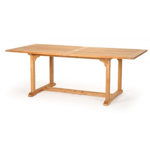 Modern teak rectangle extendable patio dining table. Table extends from 60 inches to 96 inches. The unique built in extension system unfolds to expand your seating area, or folds away to create a smaller table. Standard umbrella hole is only accessible with the extension. Seats 8 comfortably. Simple and elegant design. Made with kiln-dried, grade a teak wood. Teak wood is natural and suitable for outdoors. Requires regular teak wood maintenance. Easy assembly required. Dimensions: 60-96"L × 40"W × 30"H.