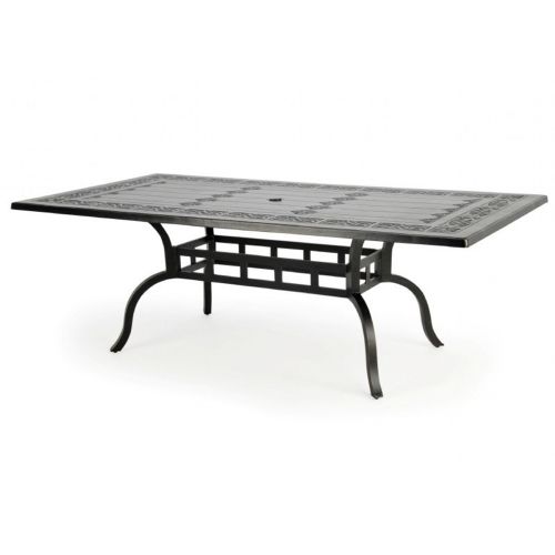 Novara cast aluminum outdoor patio dining table with 86 inch length and 44 inch width. Country club style dining table. Made of high quality cast aluminum and is triple polished with a powder coated paint and an antique finish. Cast aluminum won't chip, flake or scratch. Perfect for outdoors, gardens, patios. Easy assembly required. Comes with a 2 inch umbrella hole. It accommodates 6-8 guests. Plastic foot levelers included.