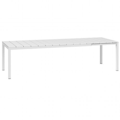 Rio resort quality extension dining table with resin top and aluminum legs. Table top extends from 82 inches up to 110 inches. Extension can be stored under the table. Table top made of marine grade resin. Extremely durable and comfortable. Commercial grade. Resistant to UV, salt, chlorine and suntan oils. Resin stays cool to the touch under hot sun. Table legs are aluminum with surface levelers.