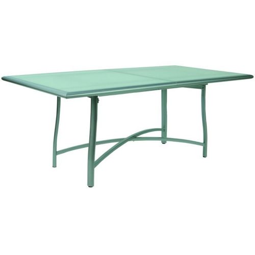 Triconfort Rivage lacquered aluminum rectangular table with extension leaf and sanded tempered glass top. Rivage collection is a very high end outdoor furniture collection. Rectangle outdoor table is 100% outdoors resistant. Aluminum frames are painted with the same process used on luxury cars. Very elegant and modern design. Exquisite aluminum craftsmanship. Table is 74 inches long without the extension and 98 inches with the extension and 38 inches wide. Outdoor table accomodates 8 without the extension and 10 guests with the extension. Available in 2 colors. White and Silver gray.